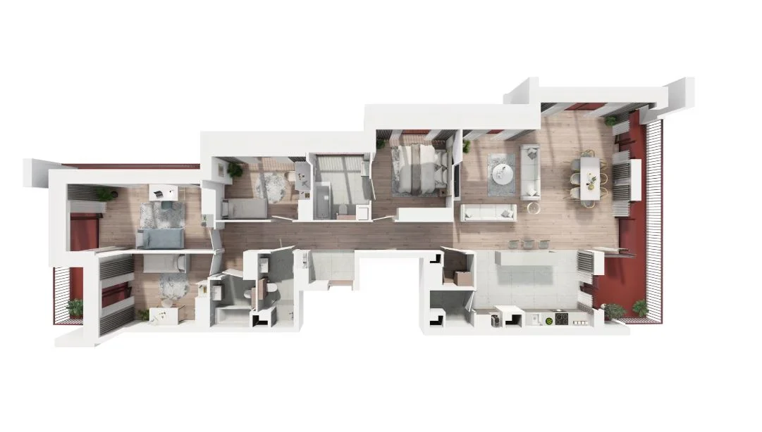 The project presents unique 5-room apartments that are perfect for a comfortable life. The entrance zones of the house are decorated with decorative structural paints and tiles in the style of terrazzo, and soft lighting creates an elegant atmosphere. The inputs are released by varnished metal in champagne color and an individually designed pattern on architectural concrete.