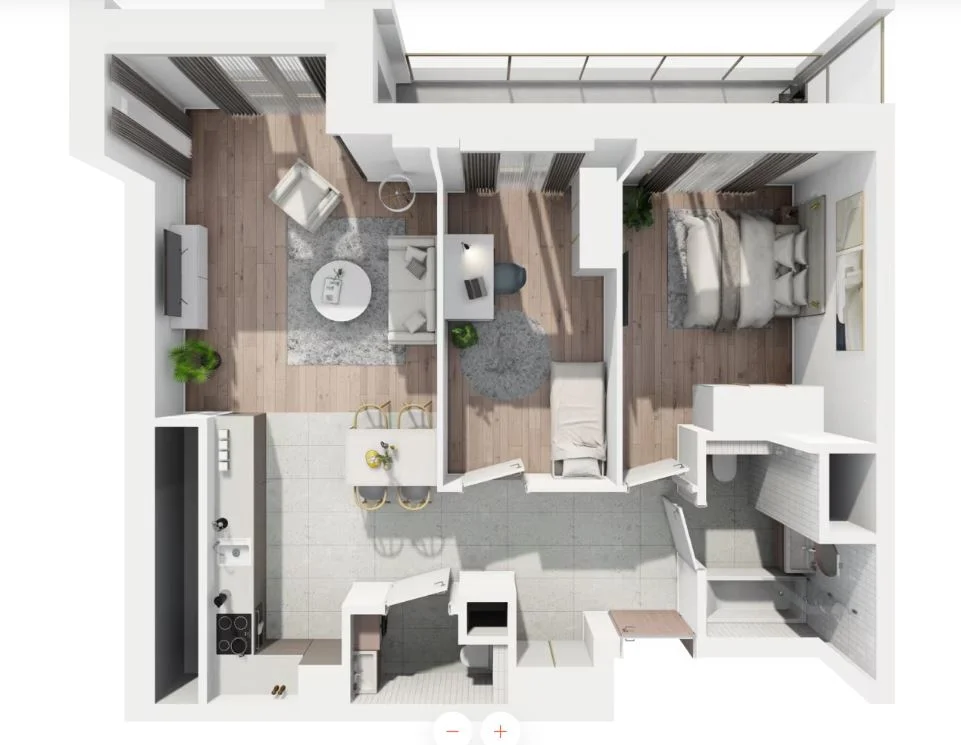 This spacious three-room apartment on the 8th floor perfectly combines comfort and style. The entrance halls of the house are decorated with decorative structural colors, the floors are lined with tiles in the style of terrazzo, and muffled lighting creates an elegant atmosphere at the entrance to each apartment. The entrance areas are released with varnished metal in elegant champagne color and an individually designed pattern on architectural concrete.